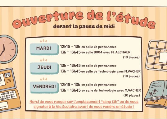 Par Sophie Gueidan, publié le mardi 30 septembre 2025 06:40 - Mis à jour le mardi 30 septembre 2025 06:40Les élèves qui souhaitent travailler au calme durant la pause méridienne peuvent se rendre dans les salles d'étude (voir horaires et salles dans le document ci-joint). -