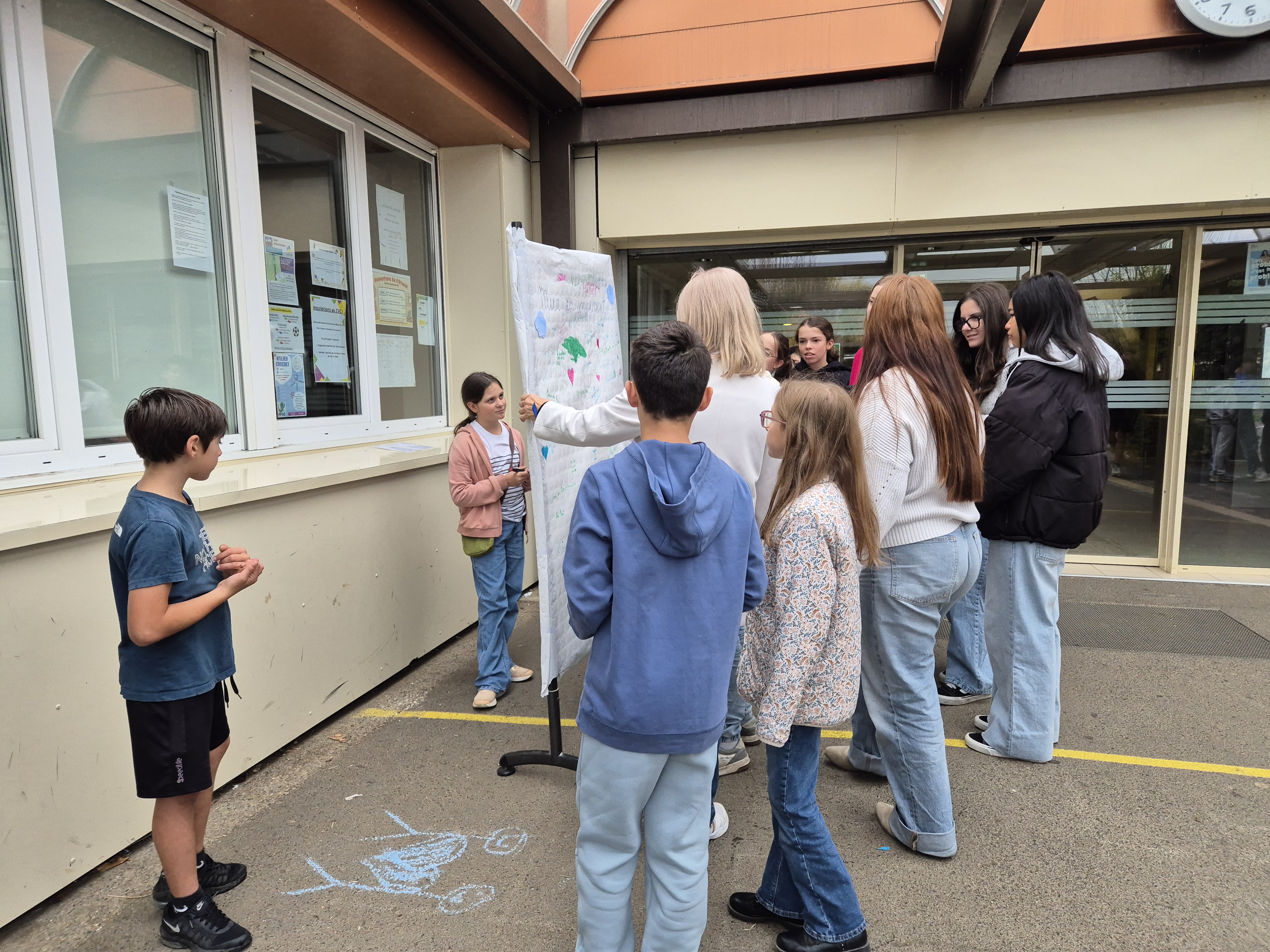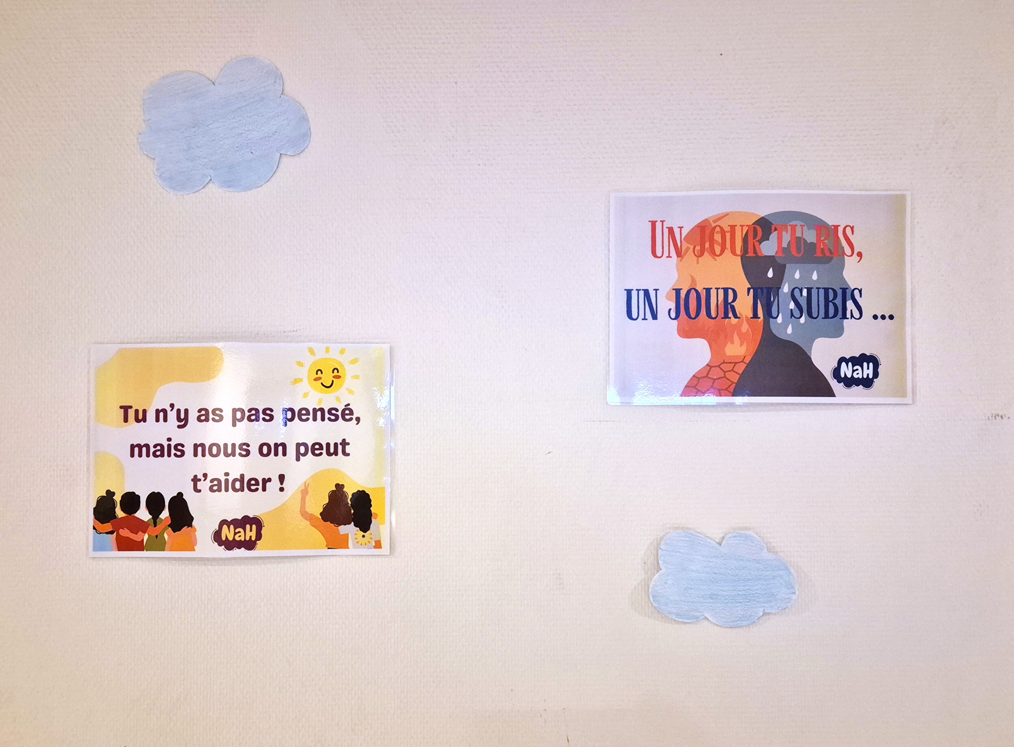 Les élèves ambassadeurs NAH ont réalisé des affiches et animé des ateliers lors de la pause méridienne: un atelier action ou vérité, un atelier "un ruban contre un mot gentil", le mur des compliments.